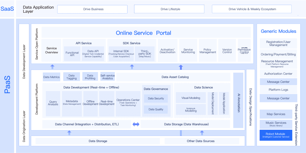 The data generation layer is responsible for collecting and accessing original data from the business end. In terms of standards, establish a comprehensive data lifecycle generation system; technically, optimize vehicle-end data technology to support collection and access of millions of different types of data.