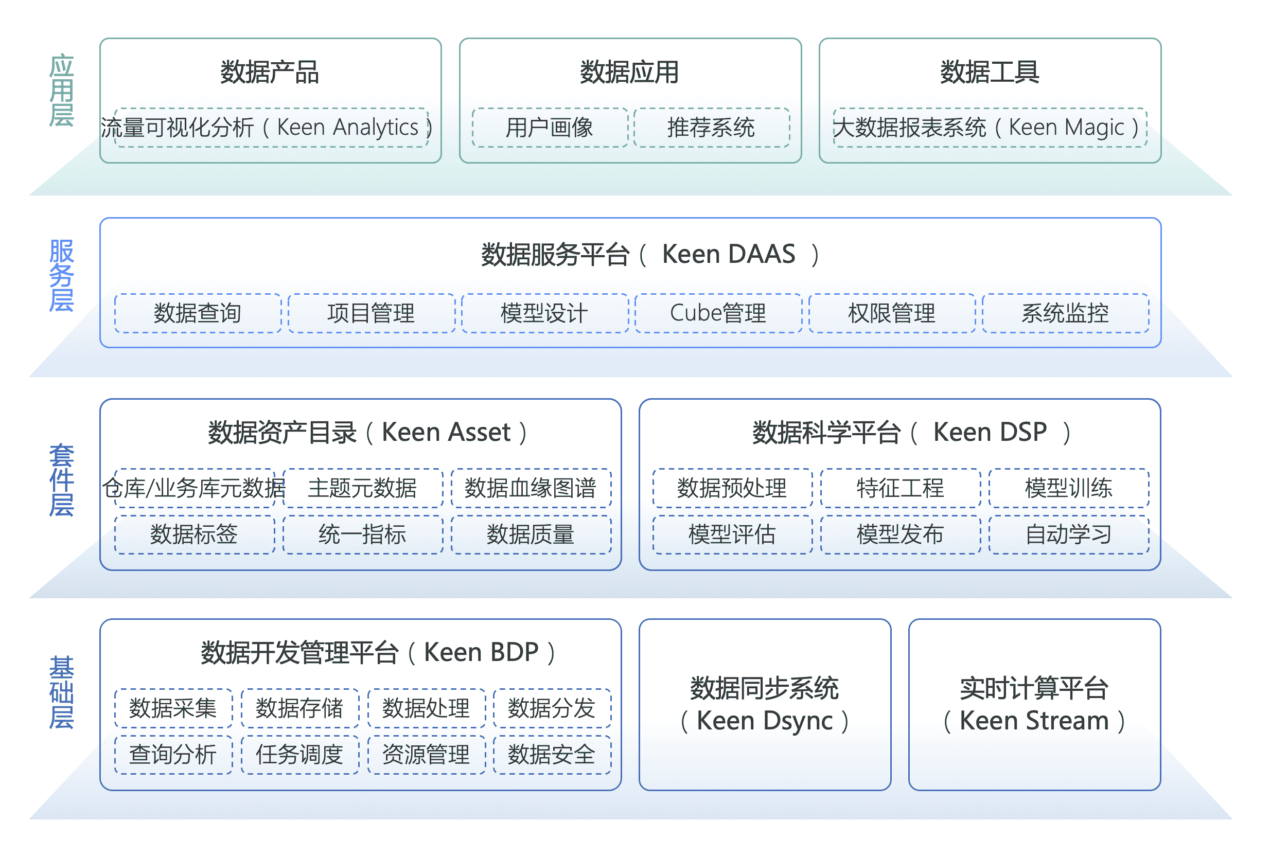 近期,科杰发布了其国产化大数据最新产品矩阵KeenData3.0。具体来说,KeenData3.0由Keen Asset(数据资产平台)、Keen BDP(数据开发管理平台)、Keen Stream(实时计算平台)、Keen DaaS(数据服务平台)、Keen Dsync(数据同步平台)、Keen DSP(数据科学平台)、Keen Persona(画像平台)、数据魔方(Keen Magic)构成,支撑万台节点规模,数千人在线协同。该数据中台产品覆盖了数据处理的全生命周期,快速整合构建全域数据资产,实现数据统一、标准、资产化的开放使用。