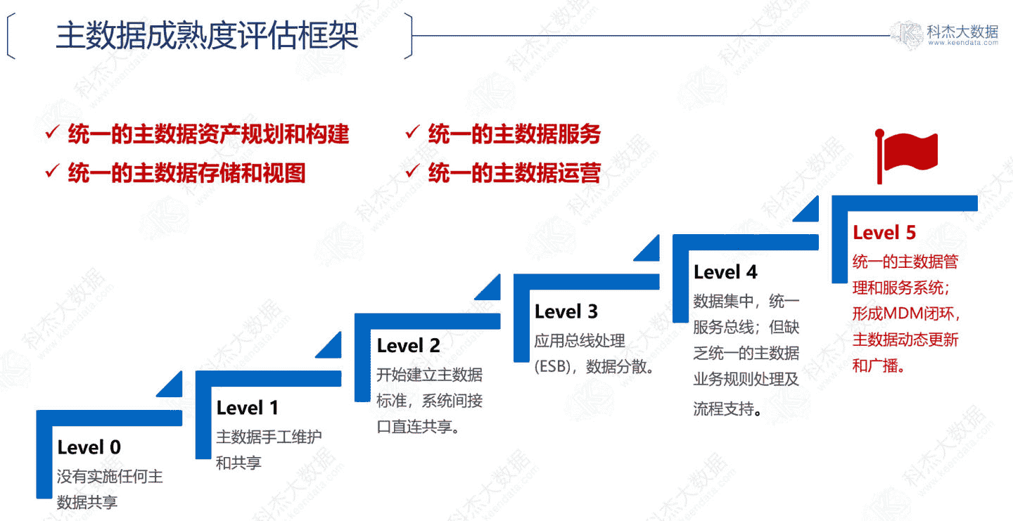 市场公认的DMM企业数据管理能力框架中涵盖了8个组成部分,数据治理是其中之一,主数据管理是数据治理的重要组成和最佳切入点。 一般来说,业界对主数据治理的成熟度有一个评估框架。这个框架对主数据建设水平进行了划分,从0~5共分为6个层级,随着行业的发展,Level5更符合现代企业的主数据管理目标。
