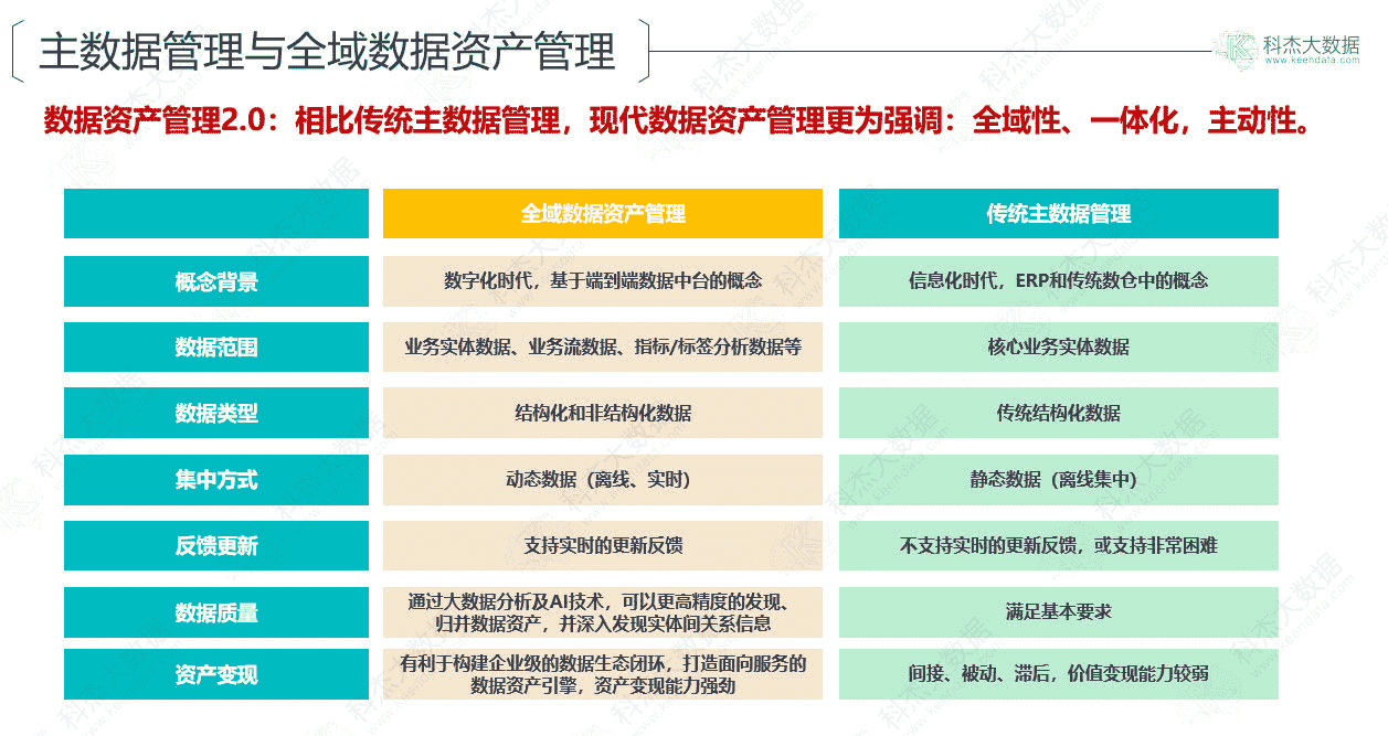全域数据资产管理包括一套完整的数据管理和数据运营体系,相比传统主数据管理更为强调:全域性、一体化,主动性。下图为两者的对比: