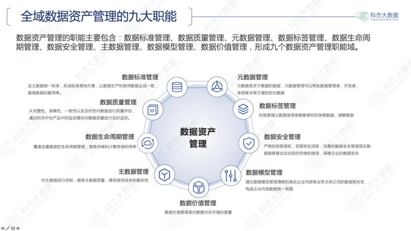 从平台角度,全域数据资产管理应包含九大职能,具体如下图: