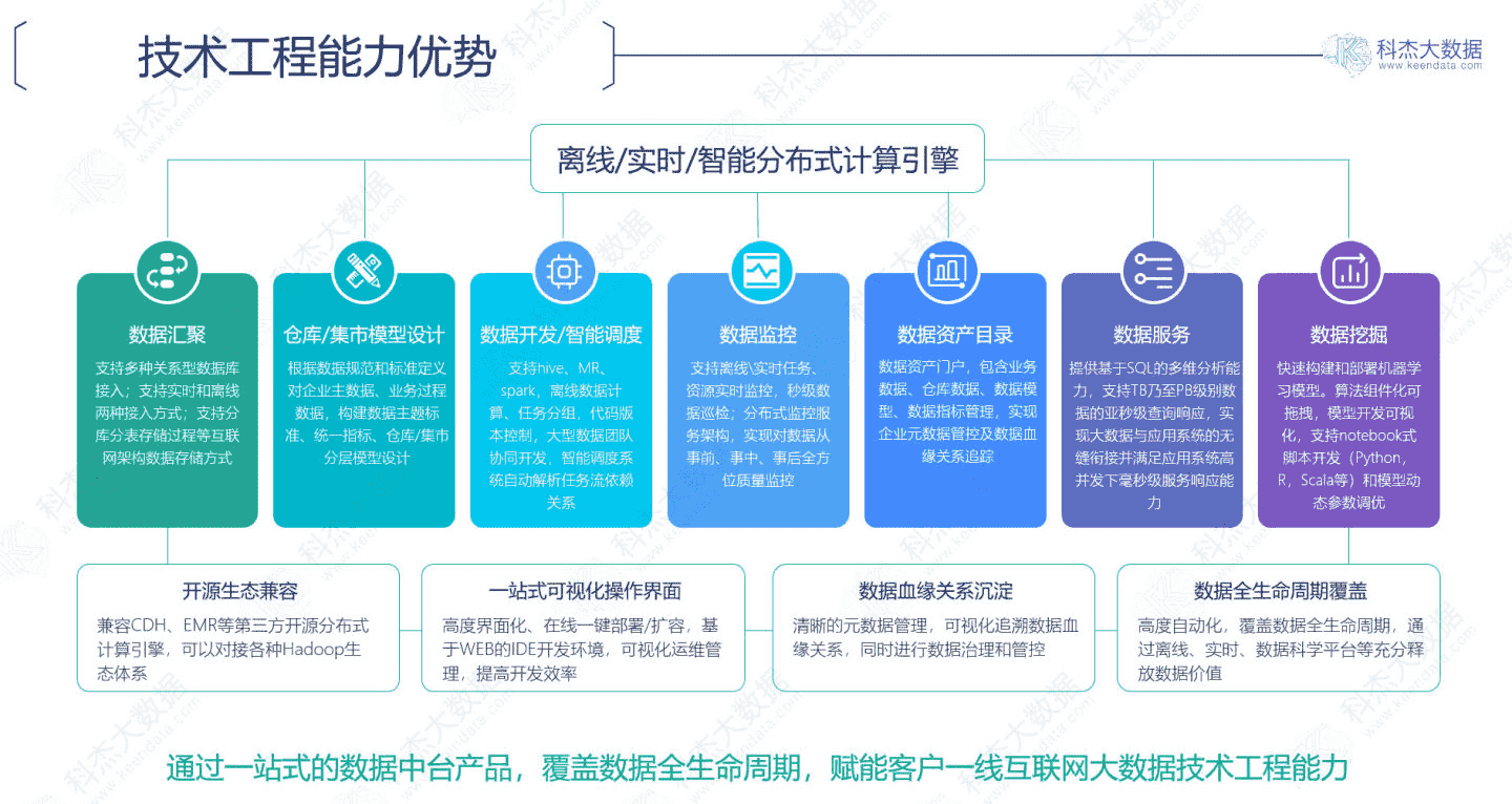 更为可贵的是,科杰大数据拥有自主知识产权的一站式产品体系,加之咨询规划能力和成熟的实施方法论,形成端到端、具有强大落地能力的一站式解决方案。