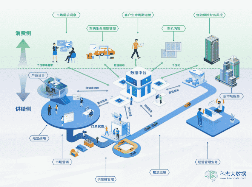 以数据中台作为汽车行业数字化转型的核心引擎,可以打通供给侧和消费侧全链条数据的统一汇聚。面向供给侧,指导产品设计、生产研发和市场营销及后市场服务;面向消费侧,基于数据构建统一的用户画像、车辆画像,提升消费侧用户体验。