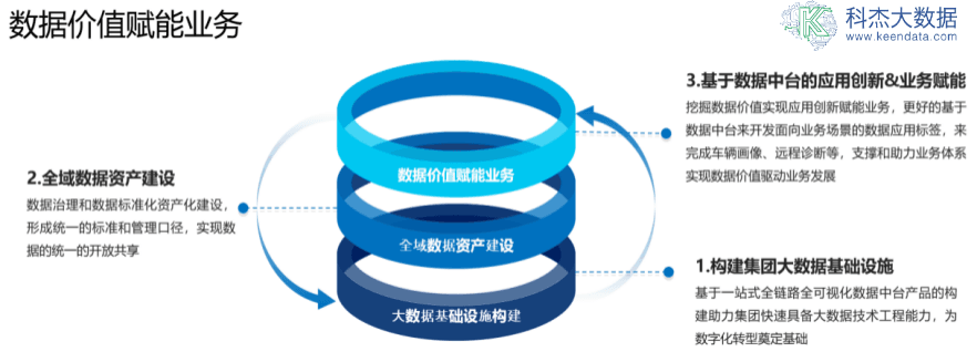 据悉,科杰数据中台的打造分为三个步骤:第一阶段构建大数据基础设施;第二阶段建设全域数据资产;第三阶段基于数据中台的应用创新和业务赋能。数据中台的打造,可以有效的加速业务闭环生态体系建设,构建可高度共享、开放、复用、持续、统一的数据动态闭环生态体系。