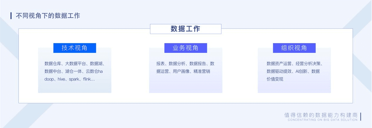 对于企业来说,可以从三个视角去看待数据工作,即技术视角、业务视角和组织视角。从不同的视角出发,相应的工作需求各不相同。