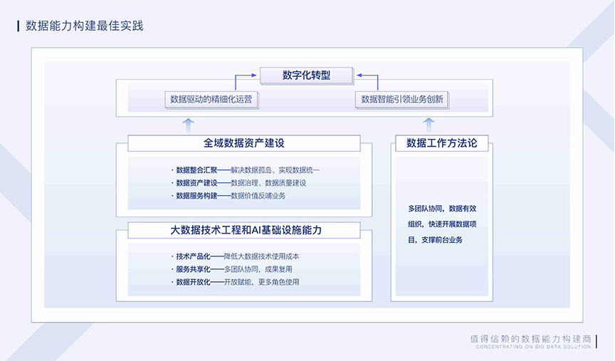 以上三点虽然可以很好地概括企业数字化转型的终极目标,但并不是大数据部门可以落地执行的内容。