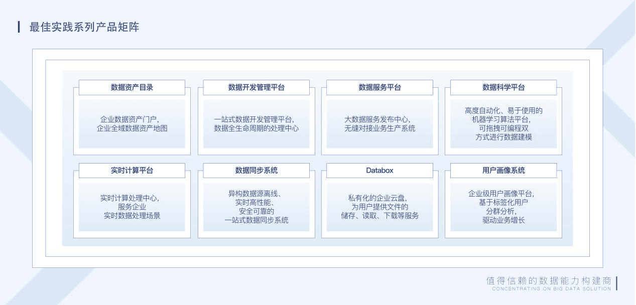 围绕前文提到的集团大数据部门应具备的数据能力,科杰大数据根据自身十余年的大数据技术工程能力和行业领先经验,总结出一套构建企业数据能力的最佳实践。
