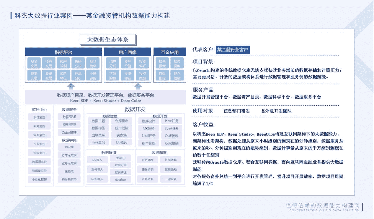 科杰大数据系列产品的数据能力包含5个核心模块:数据同步系统、数据开发管理平台、实时计算平台、数据科学平台、数据资产目录和数据服务平台,覆盖离线/实时数据同步、数据标准建立、仓库模型设计、数据开发、智能调度、数据监控、可视化查询分析、数据治理、元数据管理、数据服务等,构建企业统一大数据处理中心,实现数据汇聚、统一、资产化,服务化并面向全业务开放赋能。