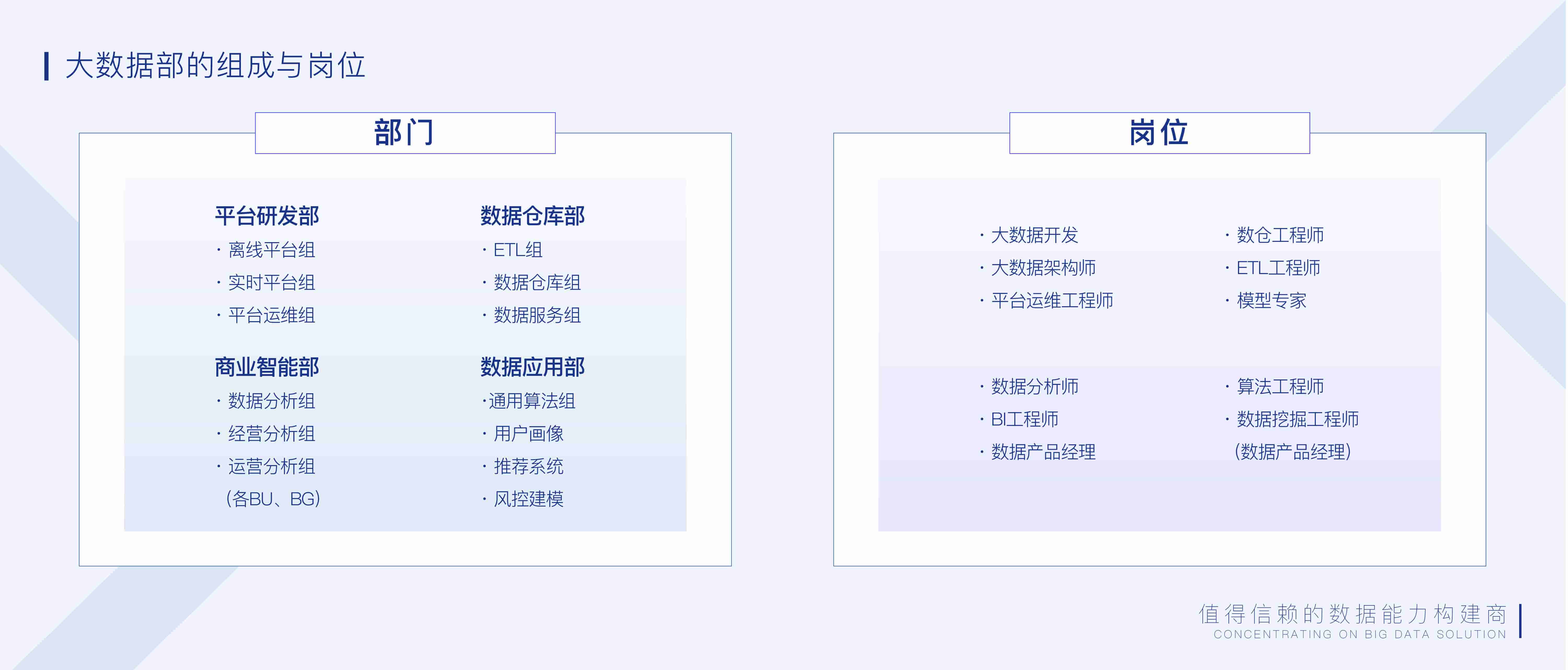 按照互联网行业的常规体系来看,大数据部门可以分为平台研发部、数据仓库部、商业智能部和数据应用部四个二级部门。(三级部门及设计的岗位名称如图所示)