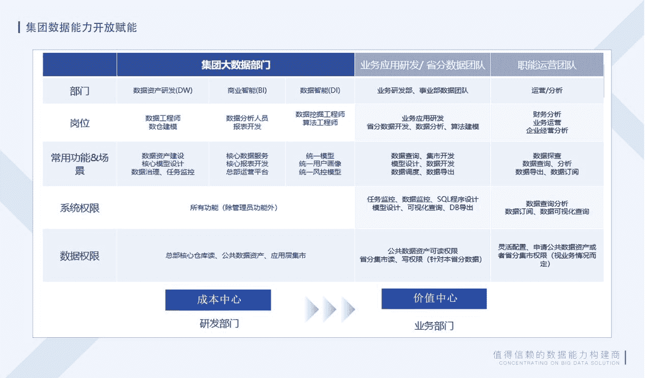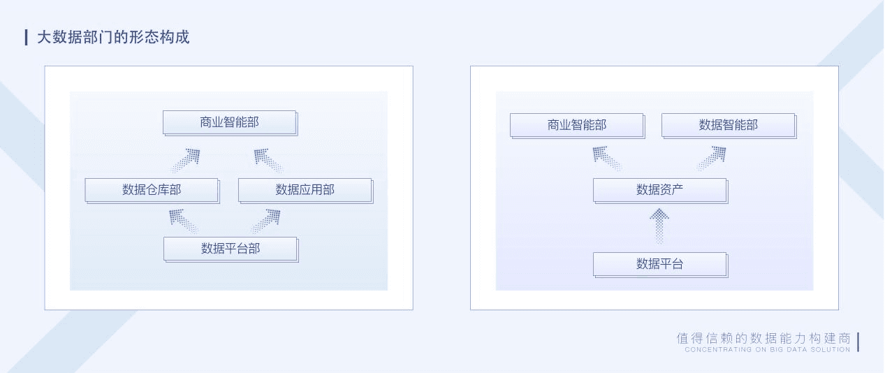 对于规模庞大的集团企业而言,为有效支撑数据工作在各组织、各体系中平稳有效地开展,其大数据部门也会进行相应的演化,以通用性更强的体系,更加开放赋能的方式面向各组织、各部门进行赋能。