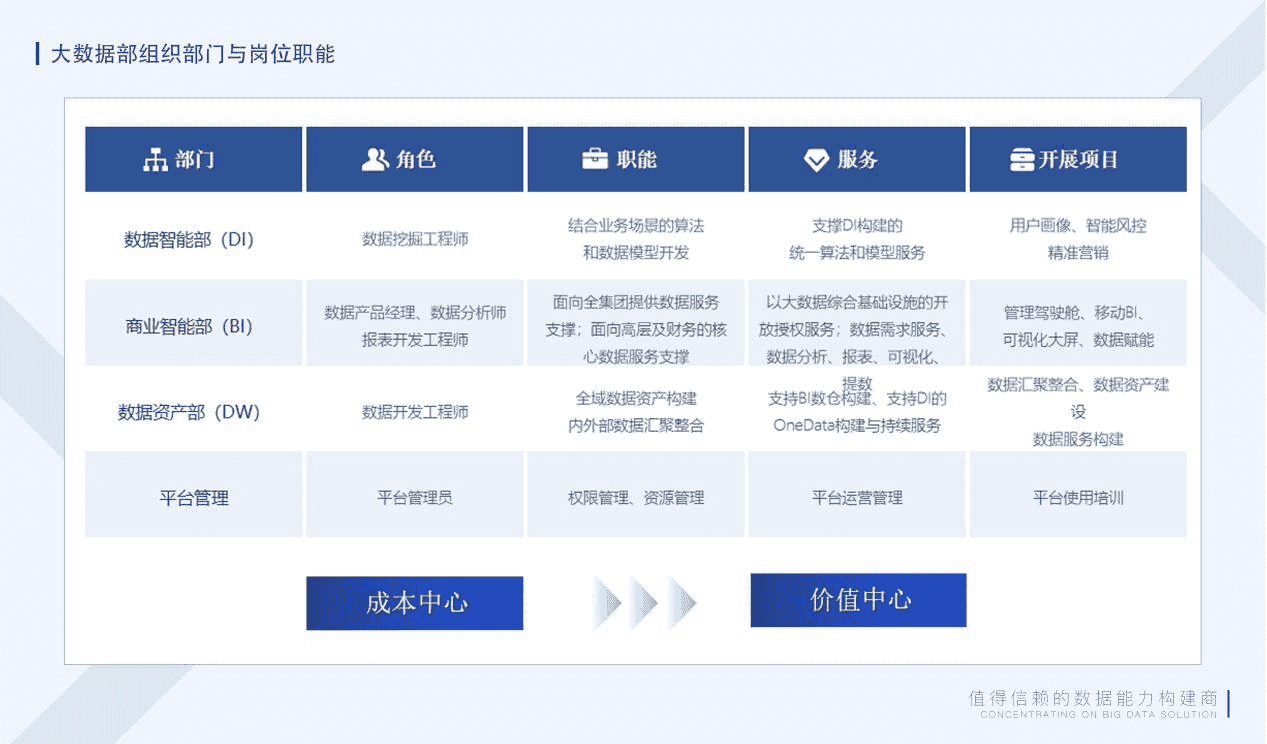 尤其是对于大数据部门负责人来说,会在研发的角度上,与各业务线进行有效地连接,从而带领团队逐渐实现从成本中心向价值中心转化的过程。