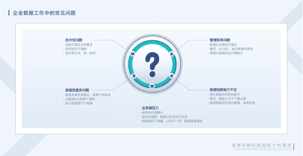 企业在构建数据能力,开展数据工作时,第一原则就是要从自身的需求出发。很多企业进行数据工作时,都是从某个点端或某一层级进行开展,缺少统一的顶层设计和规划,不能系统性地进行数据能力建设。这就导致在进行数据工作的过程中,经常遇到以下问题。