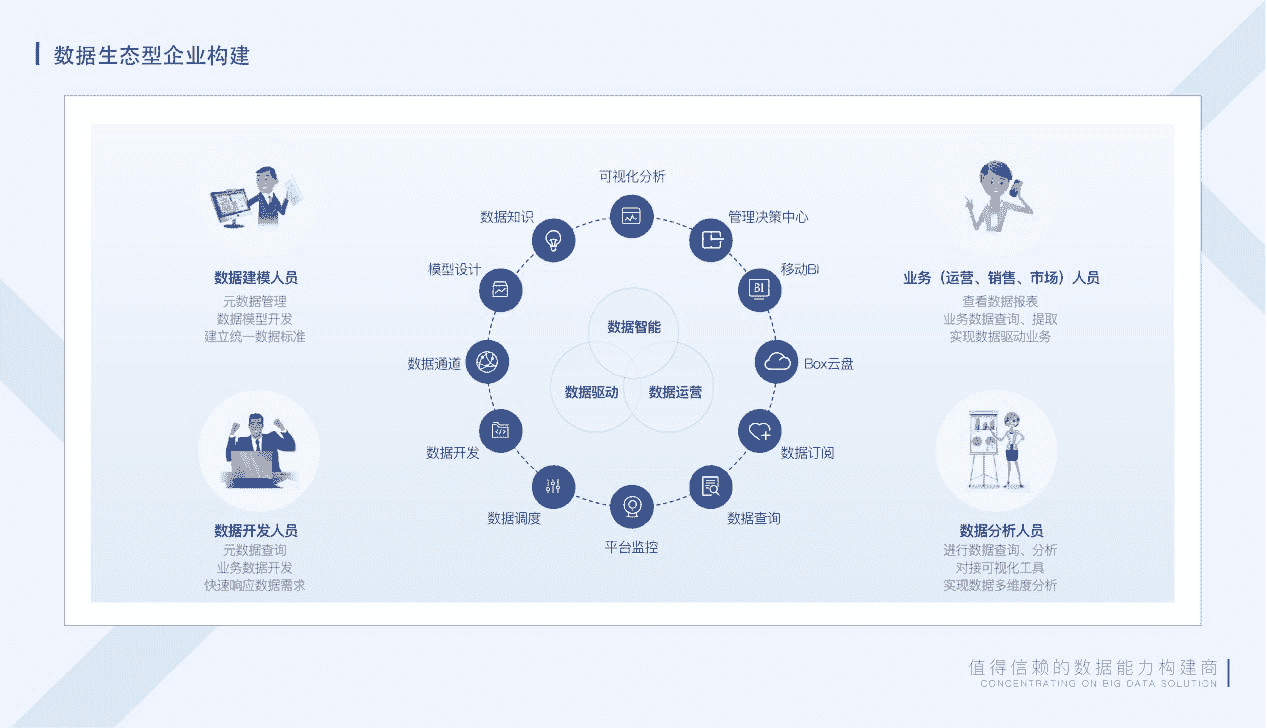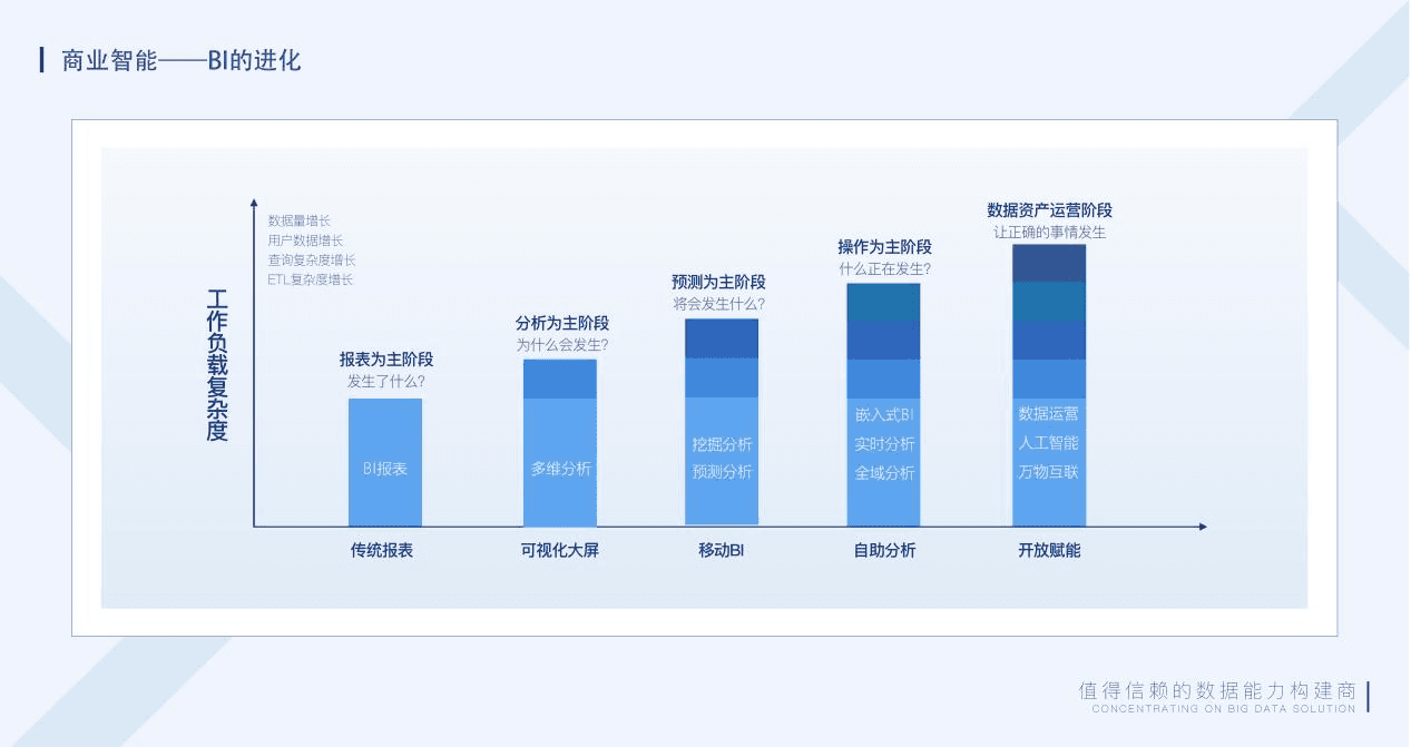 在商业智能(BI)方面,企业需要构建全域数据资产体系,以开放赋能的形式实现各业务组织对数据的自由查询、获取、分析,这也是BI进化的方向。企业最终需要实现数据驱动下的精细化运营管理,助力企业各业务线降本提效。