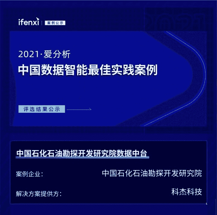 随着2021年进入收官时间,科杰科技喜报频传。近日,“2021爱分析·中国数据智能最佳实践案例”评选征集活动落下帷幕,经过申报、初评、调研、终评等多轮角逐,科杰科技携手中石化勘探院打造的“中国石化石油勘探开发研究数据中台”从103个申报案例中脱颖而出,成功获评2021中国数据智能最佳实践案例。