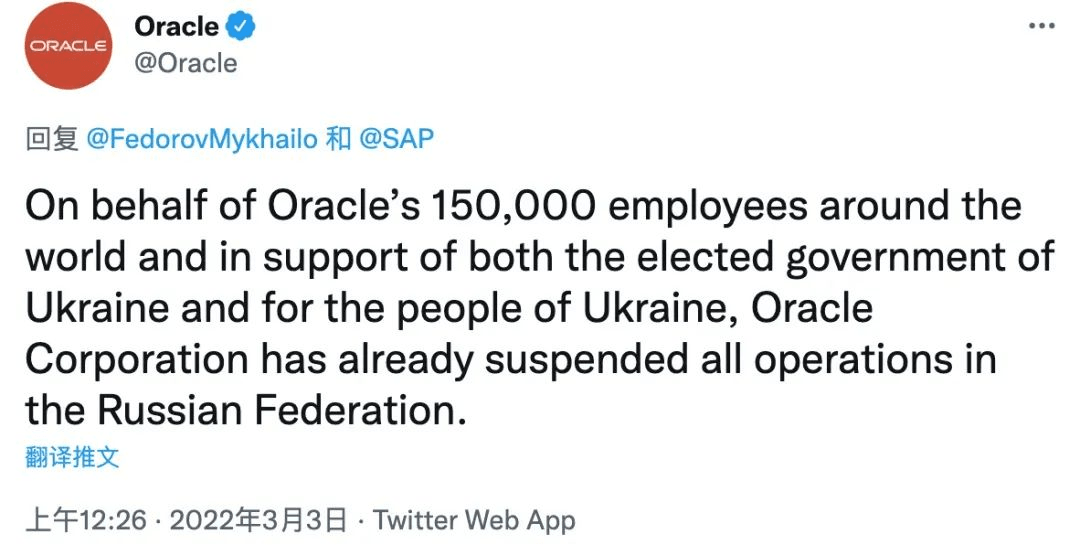 Oracle随后发推文称:“为了Oracle在全球各地的150000名员工的利益,为了支持乌克兰民选政府和乌克兰人民,Oracle公司已经暂停了在俄罗斯联邦的所有业务。”