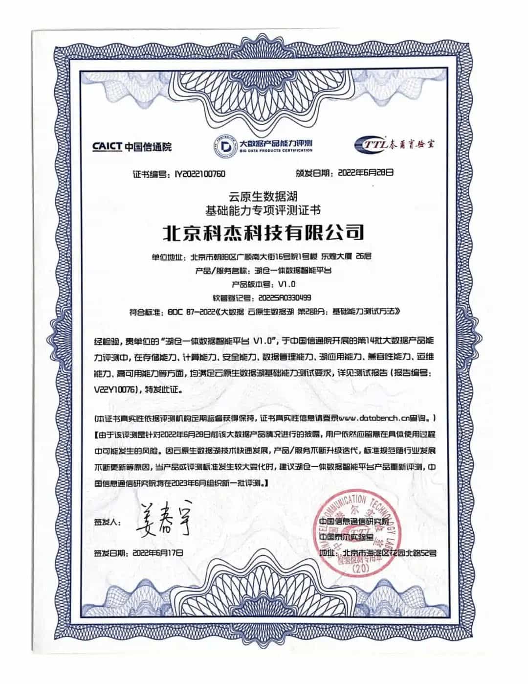 科杰科技湖仓一体数据底座产品KeenData Lakehouse凭借先进的研发理念、技术的自主可控性,成功入选测评成果名单,这标志着科杰科技KeenData Lakehouse顺利通过可信大数据首批云原生数据湖能力评测,获得中国信通院权威认可,首批通过的有阿里云、腾讯云等共五家供应商企业。