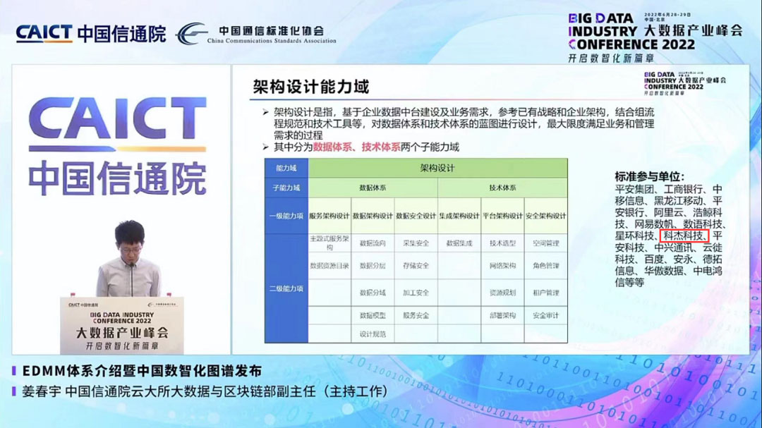 本次峰会除揭晓“可信大数据产品能力评测”成果外,还发布了《企业数智化能力成熟度模型(EDMM)》,科杰科技作为中国信通院TC601成员单位,积极参与报告的讨论及标准制定工作,为报告的成文和发布做出应有的贡献。