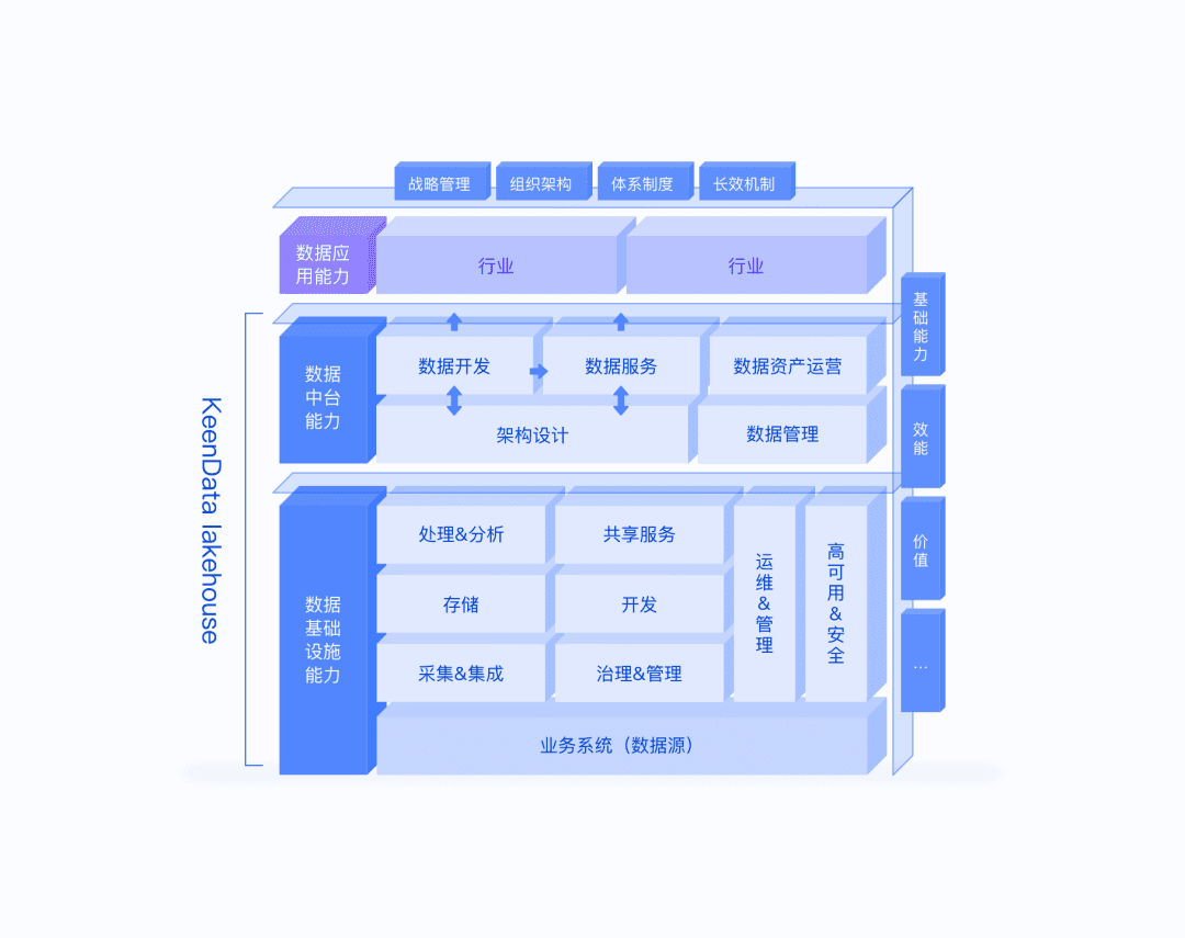 1.大数据技术工程和AI基础设施能力:采用主流大数据技术工程和AI基础设施能力,融合DataOps方法论,充分实现技术产品化,支持大规模团队协同协作,以数据基础平台(KeenKDP)、数据开发管理平台(KeenBDP)、数据资产目录(KeenAsset)、数据标准平台(KeenDSM)、数据同步系统(KeenDsync)、实时计算平台(KeenStream)、数据科学平台(KeenDSP)、数据服务平台(KeenDaaS)等八个标准化产品,组成 “存算分离、湖仓一体、批流一体” “可视化运维部署”的国产企业级大数据底座软件。面向多业态、复杂的业务场景,以乐高式的产品组合方式,持续高效地生产高质量、可复用的数据资产。