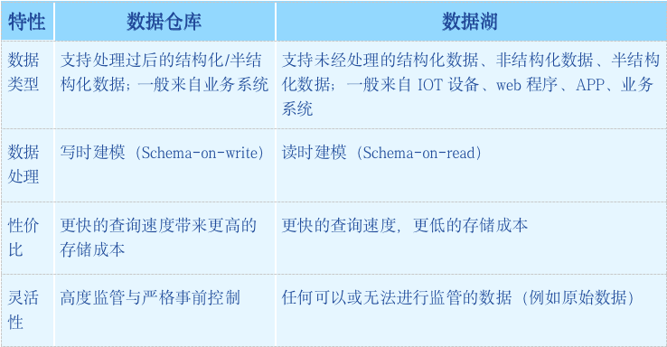 小编拿数据湖和被熟知的数据仓库在功能特性上做了对比,为了大家更好的理解数据湖的应用。
