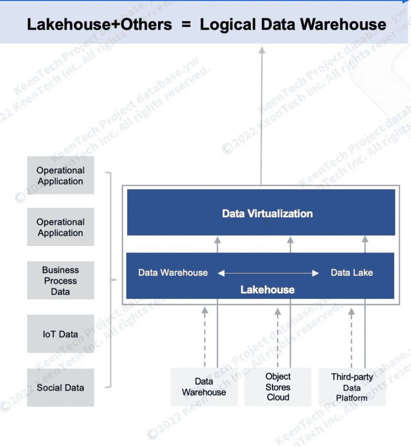 其次,企业要接受数据源在一定程度上的分散和割裂,通过多架构融合纳管来实现逻辑层面的统一;即使在数字化转型比较领先的行业,也会面临着云上数据仓库和数据平台整合或者第三方数据的现状问题。企业如果要进行新引擎的搭建,要选择技术领先的Lakehouse引擎,同时接受多物理数据,用逻辑的方式把它进行统一,建立逻辑统一数据仓库,通过产品化的方式提供 Data Virtualization 的能力完成数据业务化表达、数据组织和数据共享。