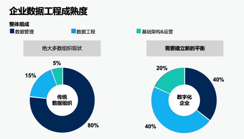 企业数据治理、数据稳定性以及数据服务存在问题,这是因为企业不具备数据工程能力,数据工程是涵盖企业全量数据连接、数据处理分析计算、数据加载管道,将数据重构为可用形式,形成一套体系化的工程。现阶段大部分企业 80% 的精力在管理数据,没有注重数据的软件工程能力、数据基础架构和运营能力,所以导致数据工作无法开展。