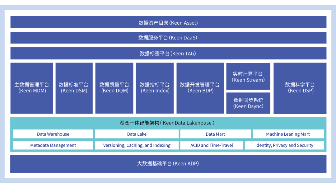 KeenData Lakehouse引用Data Fabric技术实现管理企业在不同环境、不同架构下的数据资产,同时提供多模融合计算引擎和智能解析能力,在数据处理的全链路过程中进行元数据自动跟踪和主动探查,最终展现在数据资产门户中实现主动元数据管理。