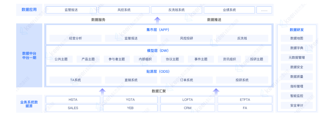 基于科杰科技湖仓一体数据底座产品矩阵KeenData Lakehouse,构建的该基金公司数据中台,汇聚了各业务系统的数据,并快速实现了历史数据迁移,营销中心、投研中心的主题数据资产构建,通过分布式计算能力,解决了该基金公司Oracle数据无法实现的迁移与计算;同时基于数资产目录,实现了数据资产的运营与管理,在数据质量与数据安全管理方面有极大的提升,通过数据中台的数据服务能力,支撑了上层包括营销主题报表、业绩分析、风控系统以及反洗钱项目等数据应用建设。