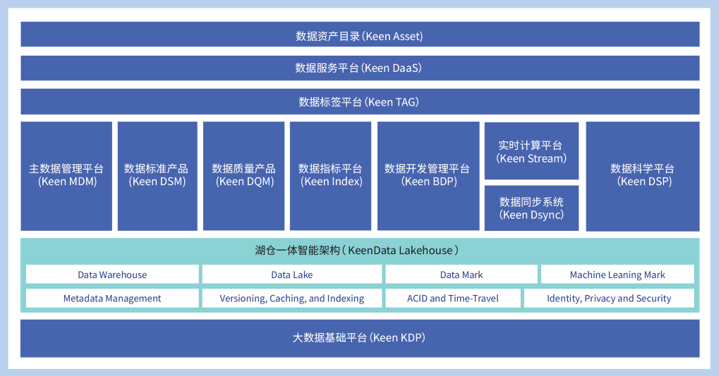 中共中央、国务院印发了《数字中国建设整体布局规划》,数字中国建设按照“2522”的整体框架进行布局,即夯实数字基础设施和数据资源体系“两大基础”。作为数字中国践行者,科杰科技湖仓一体数据智能平台KeenData Lakehouse帮助企业构筑自主可控的数字基础设施,打造涵盖企业全生命周期的“数据链”,助力企业构建完整有机数据生态体系。