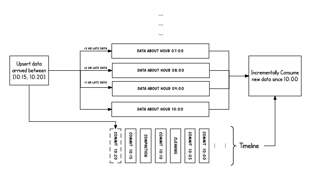 如果有延迟到达的数据(事件时间为9:00的数据在10:20达到,延迟>1小时),可以看到upsert将数据生成到更旧的时间段/文件夹中。在时间轴的帮助下,增量查询可以只提取10:00以后成功提交的新数据,并非高效地只需要更改过的文件,且无需扫描更大的文件范围,例如07:00后的所有时间段。