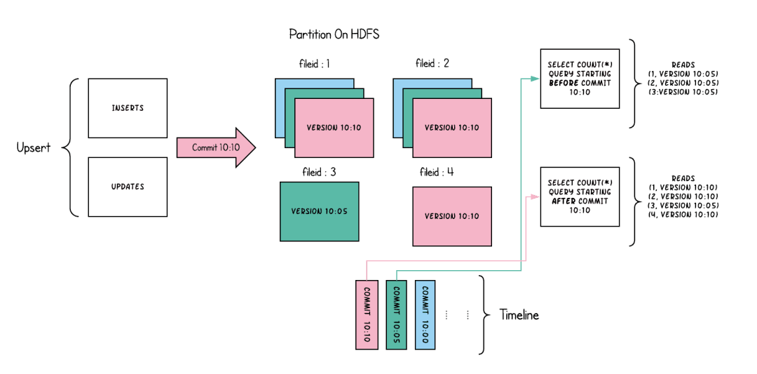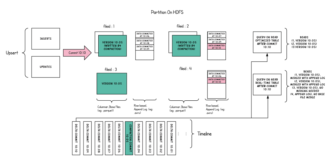 随着数据被写入,对现有文件组的更新会为该文件组生成一个带有提交即时间标记的新切片,而插入分配一个新文件组并写入该文件组第一个切片。这些切片和提交即时时间在上图用同一颜色标识。针对图上右侧sql查询,首先检查时间轴上的最新提交并过滤掉之前的旧数据(根据时间查询最新数据),如上图所示粉色数据在10:10被提交,第一次查询是在10:10之前,所以出现不到粉色数据,第二次查询时间在10:10之后,可以查询到粉色数据(以被提交的数据)。