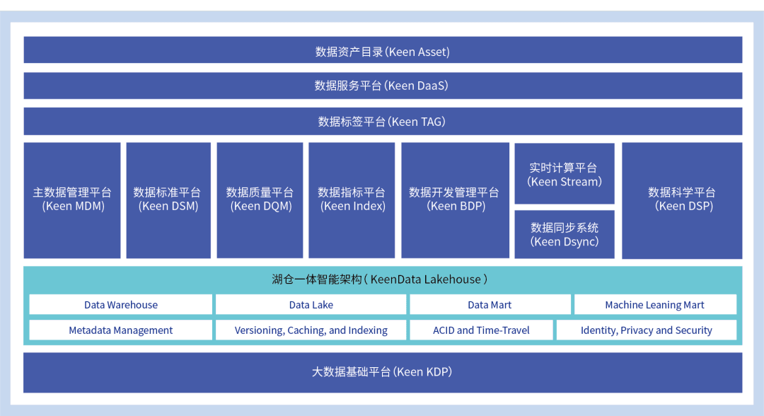 科杰科技基于领先的大数据和AI技术构建的云原生湖仓一体数据智能平台keenData Lakehouse,采用国际领先的湖仓一体新范式,充分融合了数据湖和数据仓库的优势,具备批流一体、ACID事务性、Data Fabric 、一站式全流程等特性,为企业提供数据管理、开发挖掘、运维一体化的整套方案,助力大型组织快速构建自主数据能力,以领先的数字化产品,多业态复杂场景和最佳实践方法论提供持续服务的数据体系。