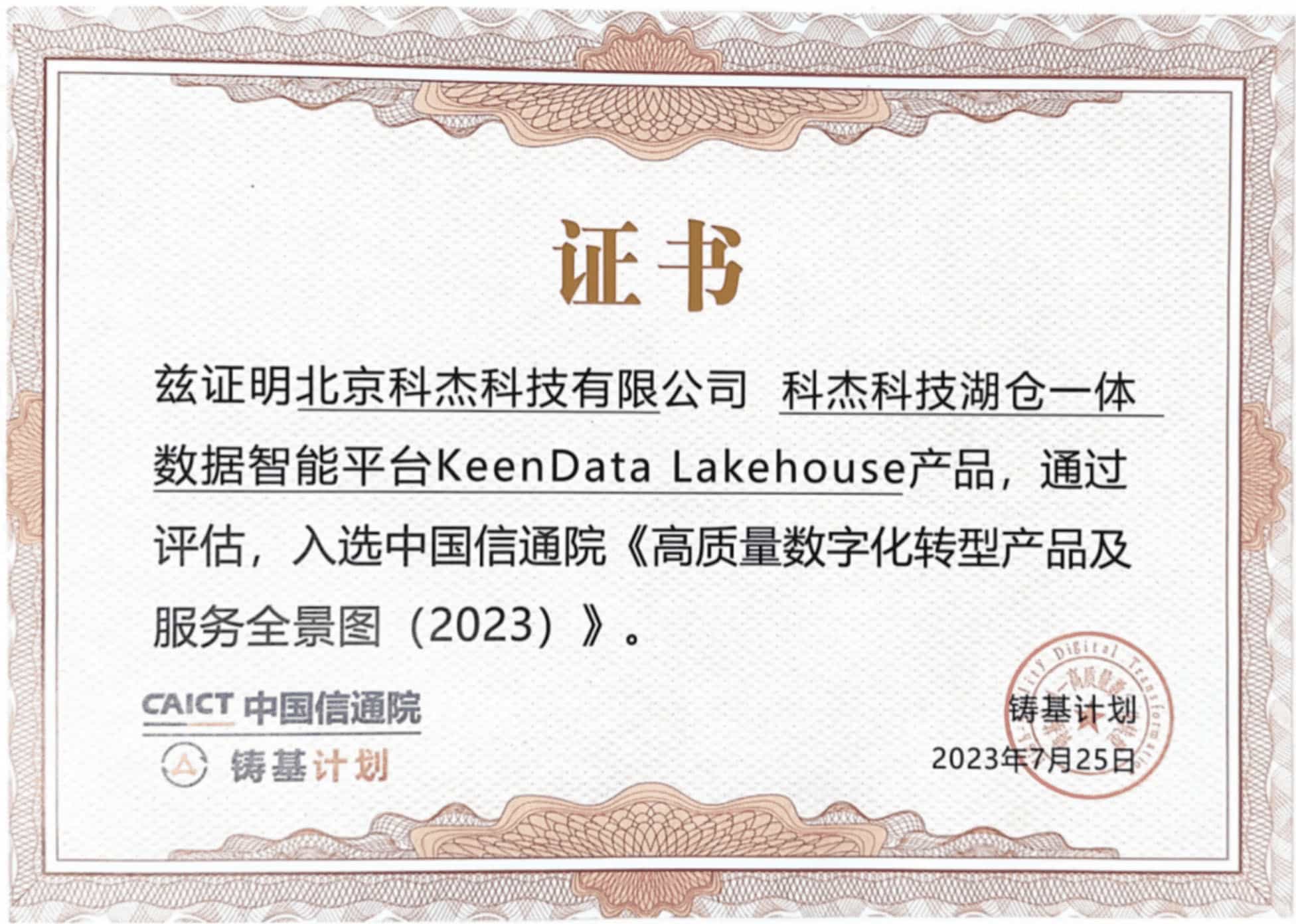 此次入选“铸基计划”《高质量数字化转型产品及服务全景图(2023)》是中国信通院对科杰科技的权威认可,也是对科杰科技的极大鼓励。未来,科杰科技以大数据技术创新驱动为牵引,助推数字经济高质量发展,基于湖仓一体数据智能平台KeenData Lakehouse,打造完善的数据基础设施和数据资源体系两大基础能力,构筑数字经济时代企业高质量数字化转型数据底座,赋能企业数字化转型升级。