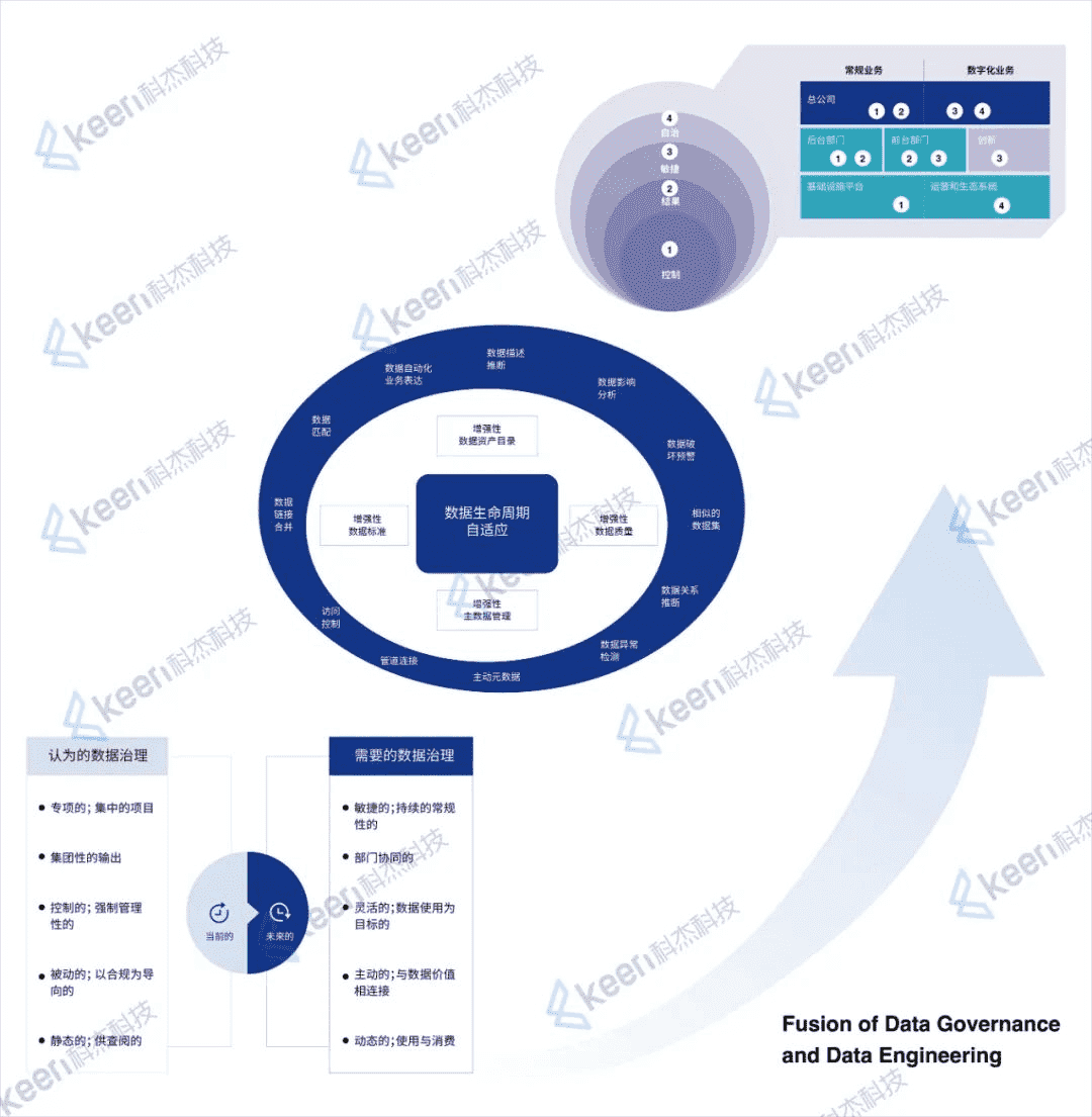 科杰科技湖仓一体数据智能平台将被动、割裂、静态的数据治理跟数据工程相融合,将访问控制、管道连接、数据合并、主动元数据探查等技术融入到数据工程上,在数据源发生变化的时候,通知相应后续使用数据的算法和模型进行人工自动化或半自动化调整,将数据可预测错误进行 AI 强化学习和提前判断,将数据的异常检测和相似的数据进行合并,以数据管理方式将传统静态的数据标准、主数据管理、数据质量、数据资产目录进行加强,以AI 探查主动和数据源、数据工程连接的方式形成自适应的数据治理能力。从由控制数据的数据治理、走向以结果为导向的数据治理、敏捷的日常数据治理到最后达成自治的系统,将数据质量高效的服务于业务端和业务前台,形成数据价值的发挥。