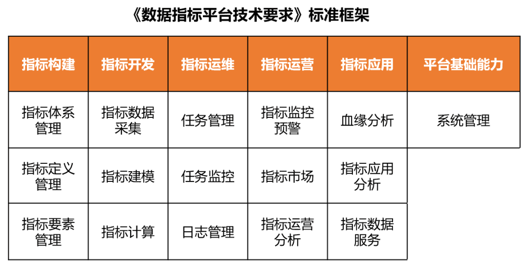 《数据指标平台技术要求》历经两个多月的四次标准讨论会,标准包括指标构建、指标开发、指标运维、指标运营、指标应用、平台基础能力共六大能力域,16个一级能力项、69个二级能力项(含22个可选能力项),这些能力项涉及数据的收集、整合、分析、可视化等方面,对于提高企业数据质量和决策效率具有关键作用,中国信通院依托该标准正式启动首批数据指标平台专项测试工作,旨在为供给侧研发和应用侧选型提供参考。