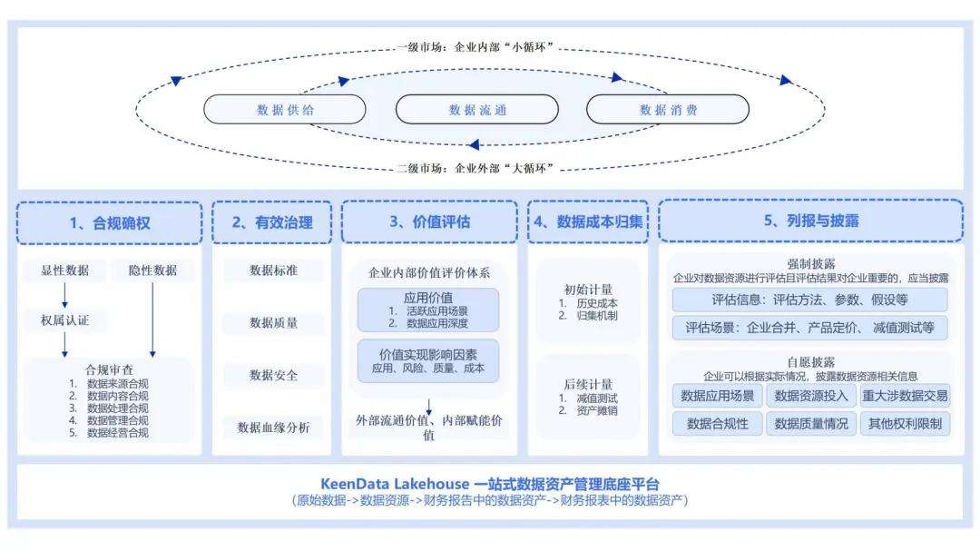 数据资产的有效管理和入表为企业高质量数字化转型发展奠定基础。科杰科技数据资产管理体系将帮助企业从"数据资产确认一数据资产评估一数据资产入表一数据资产计量一数据资产披露”五个环节着手,实现资产可视、可溯、可管、可用的资产中心和管理体系。