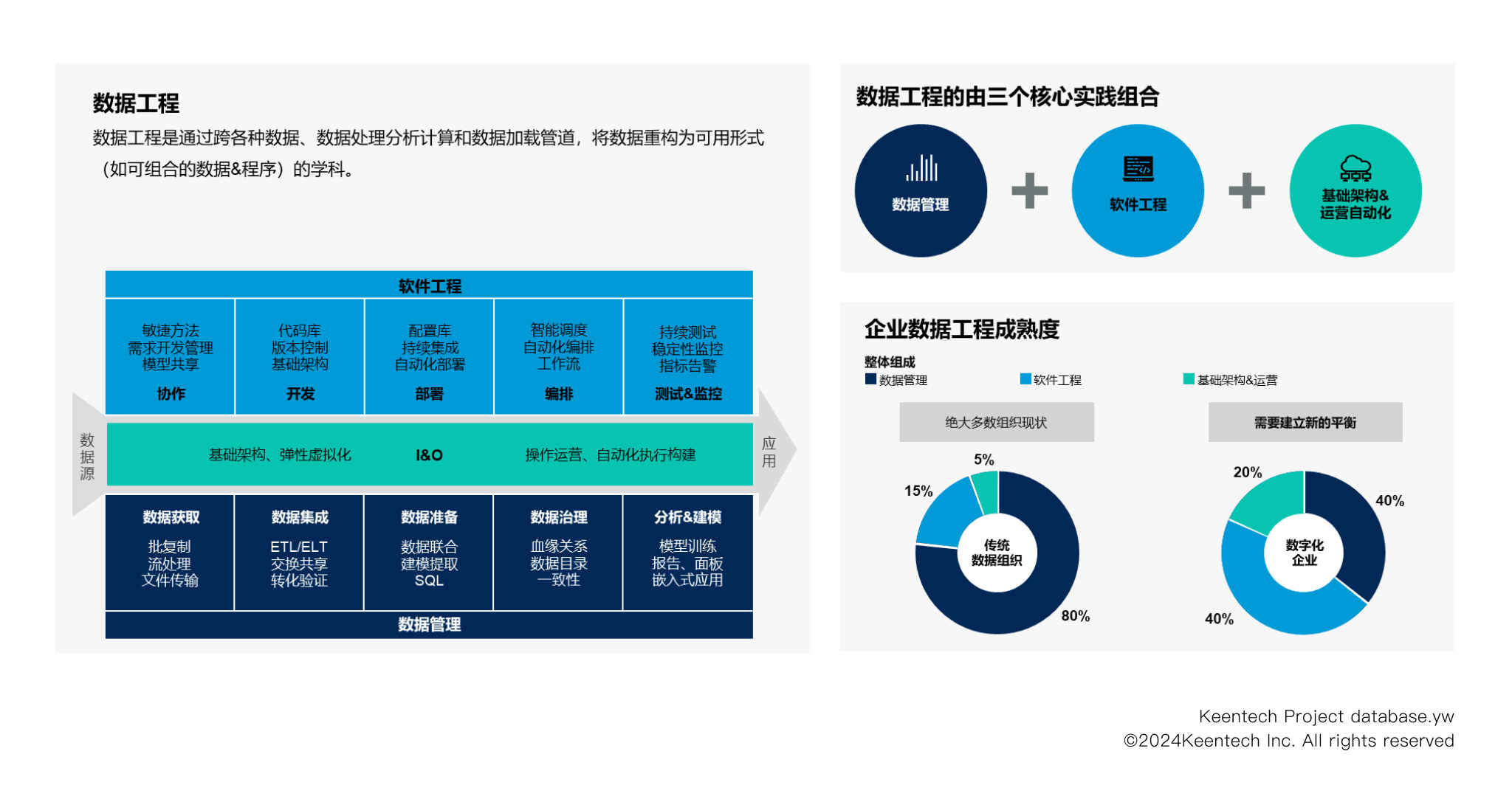 应对组织里面复杂的数据分析和规模化的数据应用,企业数据工程构建应该比软件工程优先度高。对于整个组织而言,数据工程构建是企业数字化转型成功的关键,企业需要建立软件工程平台化体系,让数据管理和数据应用事半功倍。通过数据工程体系,数据由单点的、零散的、组合式的使用数据技术转为大规模工程化协同、产品化降低门槛面向广泛IT技术人员和半IT半技术人员赋能。由此可见,数据技术走向企业的中心和工程化,是IT到DT的转型和工程化提效的问题。