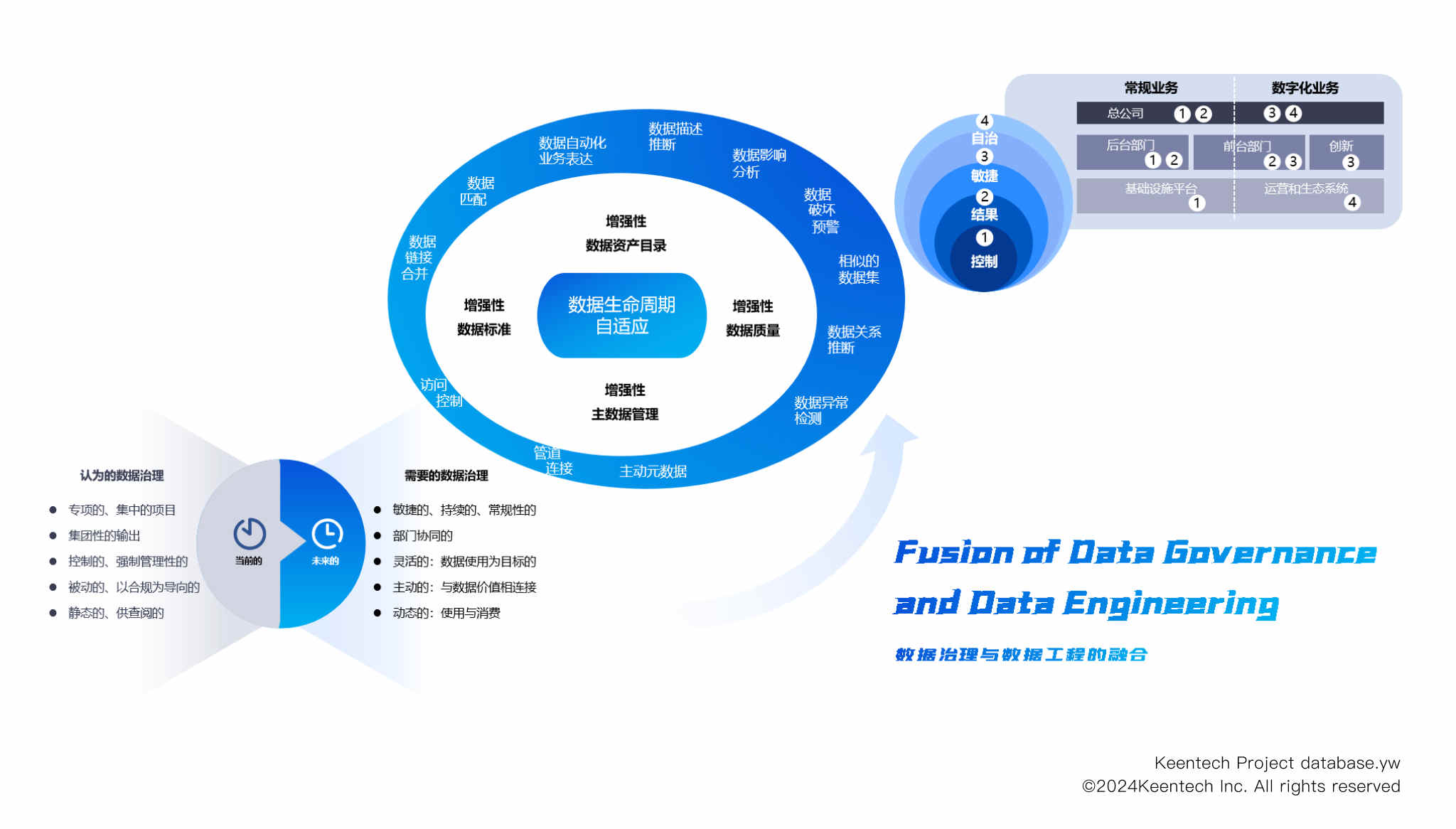 在过去,数据治理是以专项项目的方式推进数据的集中管理和管控,是被动且滞后的管控形式,跟集团的业务割裂和研发脱节。在实际业务中,数据治理应该是主动、实时以及自适应的完成治理,以数据治理和数据价值发挥为业务目标,敏捷地在业务上高效取得价值,这是一个持续且日常的行为,贯穿数据全生命周期。所以数据治理应该由传统被动且滞后的模式升级为主动且实时与数据工程相融合的新型数据治理。