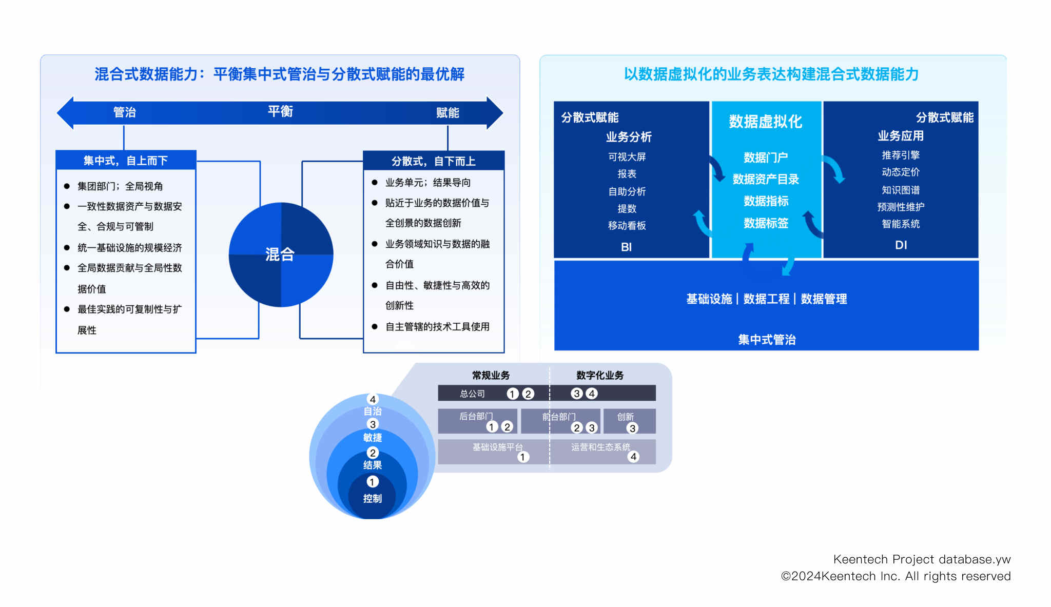 企业如何平衡更多的业务部门获取数据、分析数据与集团提供基础设施和数据资产管理的平衡性,进一步达成数据驱动型组织的问题?这就需要新的平台提供逻辑统一数仓和高度的数据虚拟化的能力,将数据进行业务转化和表达,面向业务进行开放赋能,将从过去的、被动的、单一支撑性的协作关系,走向数据和数据工具面向业务主动赋能和协作的方式。
