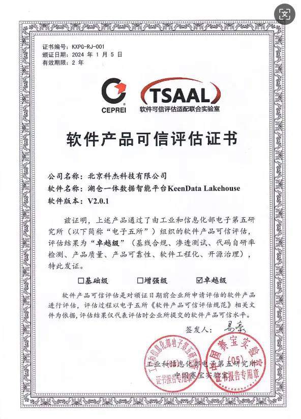 KeenData Lakehouse在本次软件产品可信评估中,基线合规、渗透测试、代码自研率检测、产品质量、产品可靠性、软件工程化、开源治理模块均达到卓越级。