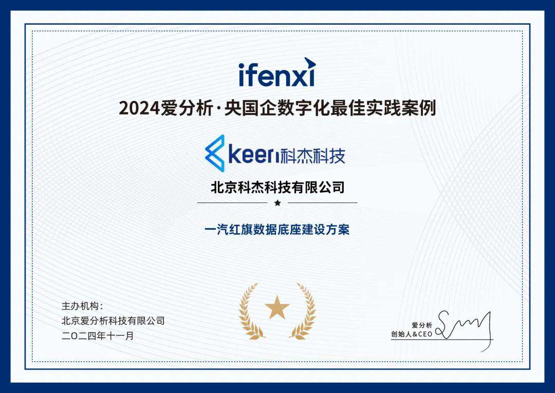 近日,"2024 爱分析 · 央国企数字化最佳实践案例 "评选活动落下帷幕。爱分析对央国企在落地过程中面临的需求与挑战、具体的解决方案、平台落地后的效果,以及相应的建设经验进行详细的研究与评估,经过申报、初评、调研、终评多轮角逐,最终评选出13 个具有参考价值的创新案例,并颁发实践案例证书,科杰科技「一汽红旗数据底座建设方案」凭借其案例应用解决方案的创新性、实用性在众多优秀的参选案例中脱颖而出,成功入选。