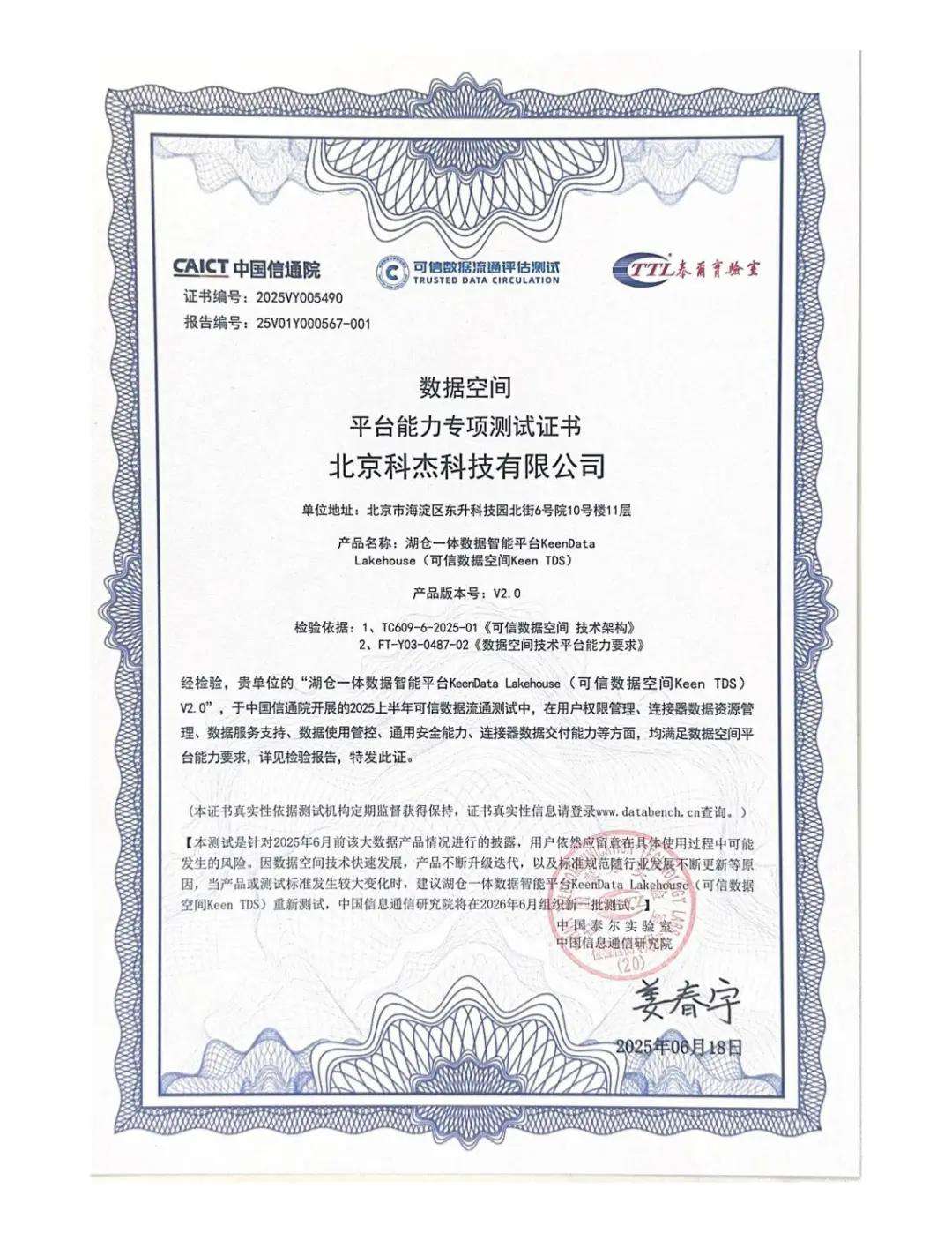 大会上,2025上半年“数据智能”系列评估测试结果正式发布,科杰科技凭借出色的技术实力和创新实践,成功通过可信数据空间权威认证,在数据安全流通领域迈出了坚实有力的一步。