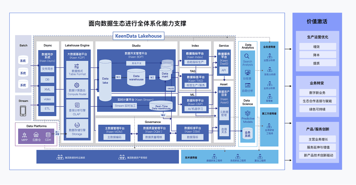 KeenData Lakehouse adopts globally leading lakehouse architecture with storage-compute separation, combining data lake flexibility with data warehouse performance. It integrates cloud-native infrastructure, batch-stream integration, ACID compliance, and machine learning capabilities.