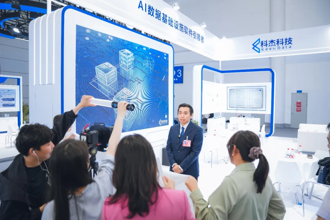 凭借在AI数据基础设施领域的持续深耕与行业影响力,科杰科技展位吸引了新华网、数据观等权威媒体的关注。董事长于洋在现场接受采访,就AI数据基础设施如何赋能智能经济新形态分享了科杰的实践与洞察。媒体与行业的双重关注,让科杰科技展位成为峰会首日的焦点。
