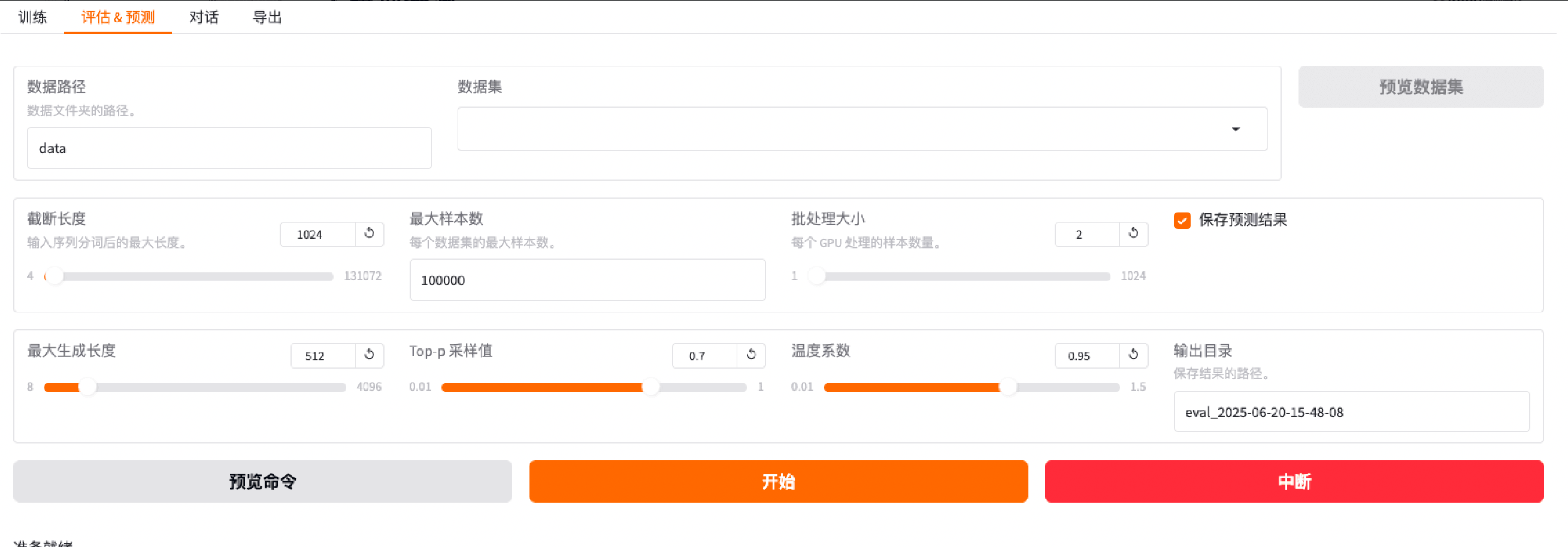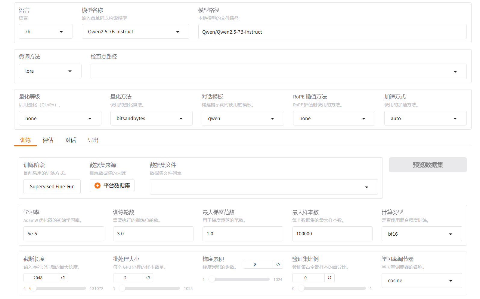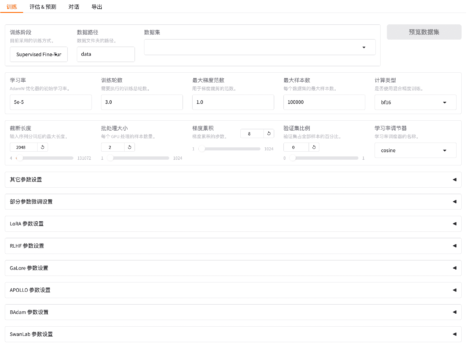 Provides an intuitive interface for configuring fine-tuning parameters, supporting the full workflow of training, evaluation, inference, and model export.