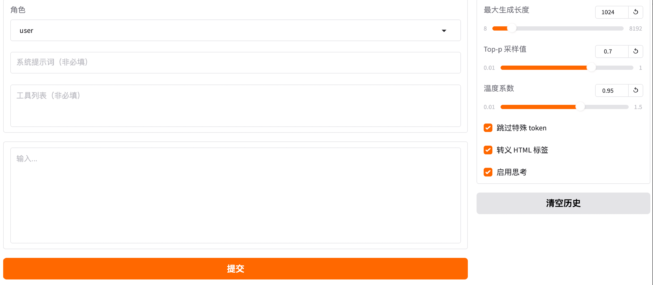 Supports inference testing with multiple configurable parameters, including max generation length, Top-p sampling, temperature, skip special tokens, escape HTML tags, and enabling reasoning.